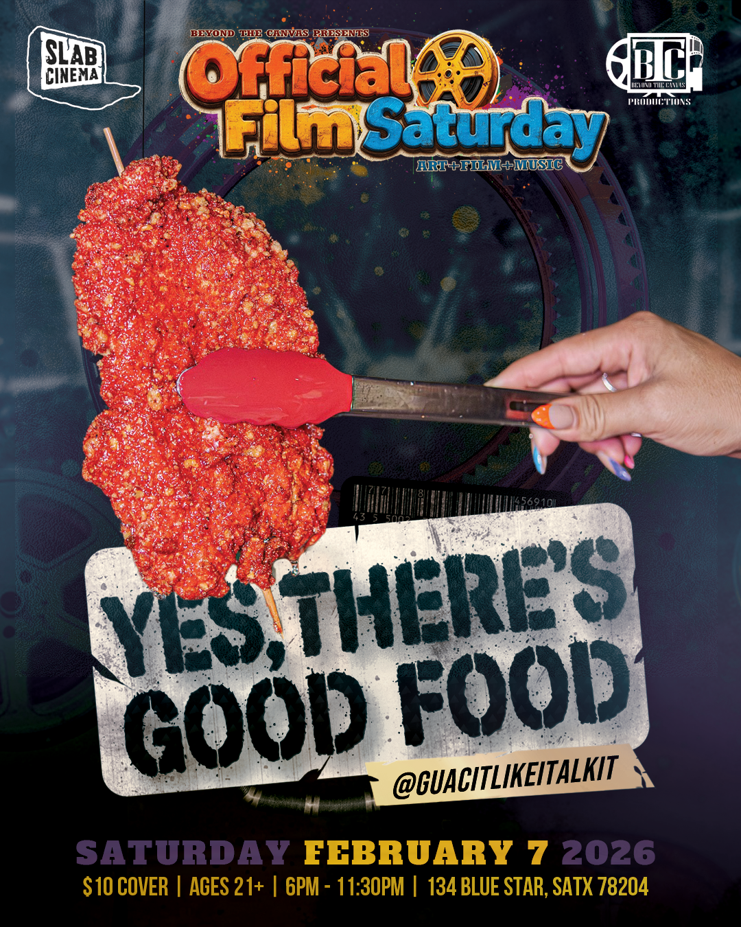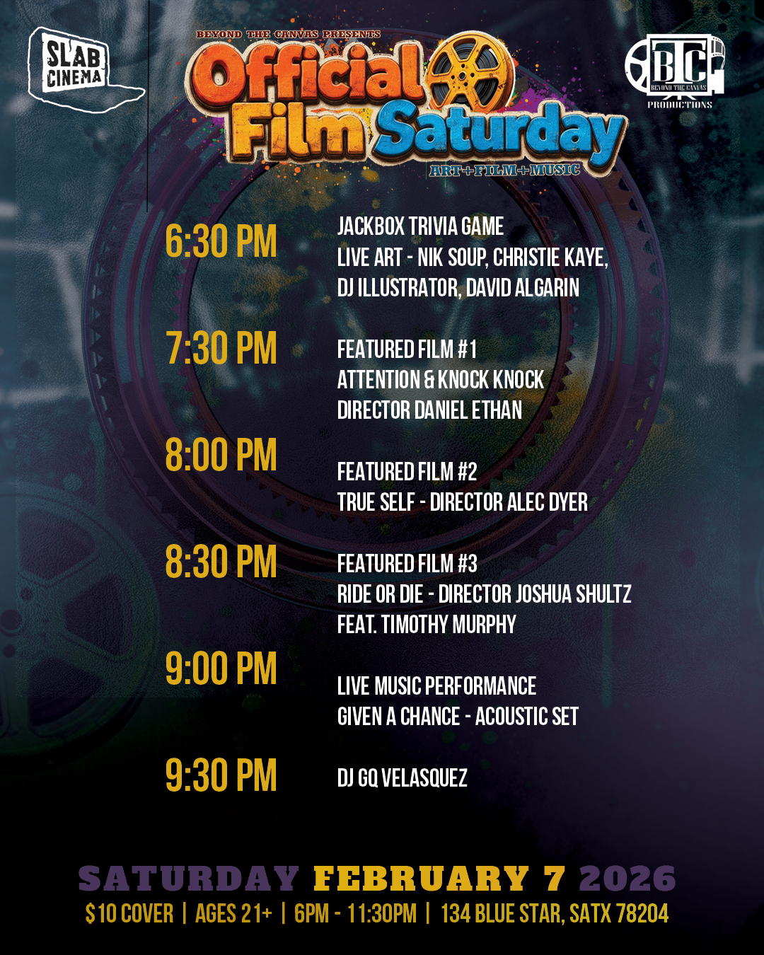 Join us for a night where art, film, and music collide at Official Film Saturday #72, the official kick-off party for our monthly First Saturday series. Hosted at Slab Cinema in the heart of Blue Star, this immersive evening celebrates independent filmmaking, visual art, and live music in a vibrant, community-driven space.
