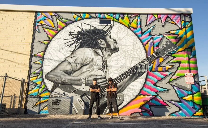 Most people see big blank walls, but muralists...they see possibilities. Google Fiber underwrote the mural with only these instructions: convey connectivity. Soupe and Vega thought music conveyed connectivity, and when they found a picture of guitarist Nick Long, they knew he was the one.
